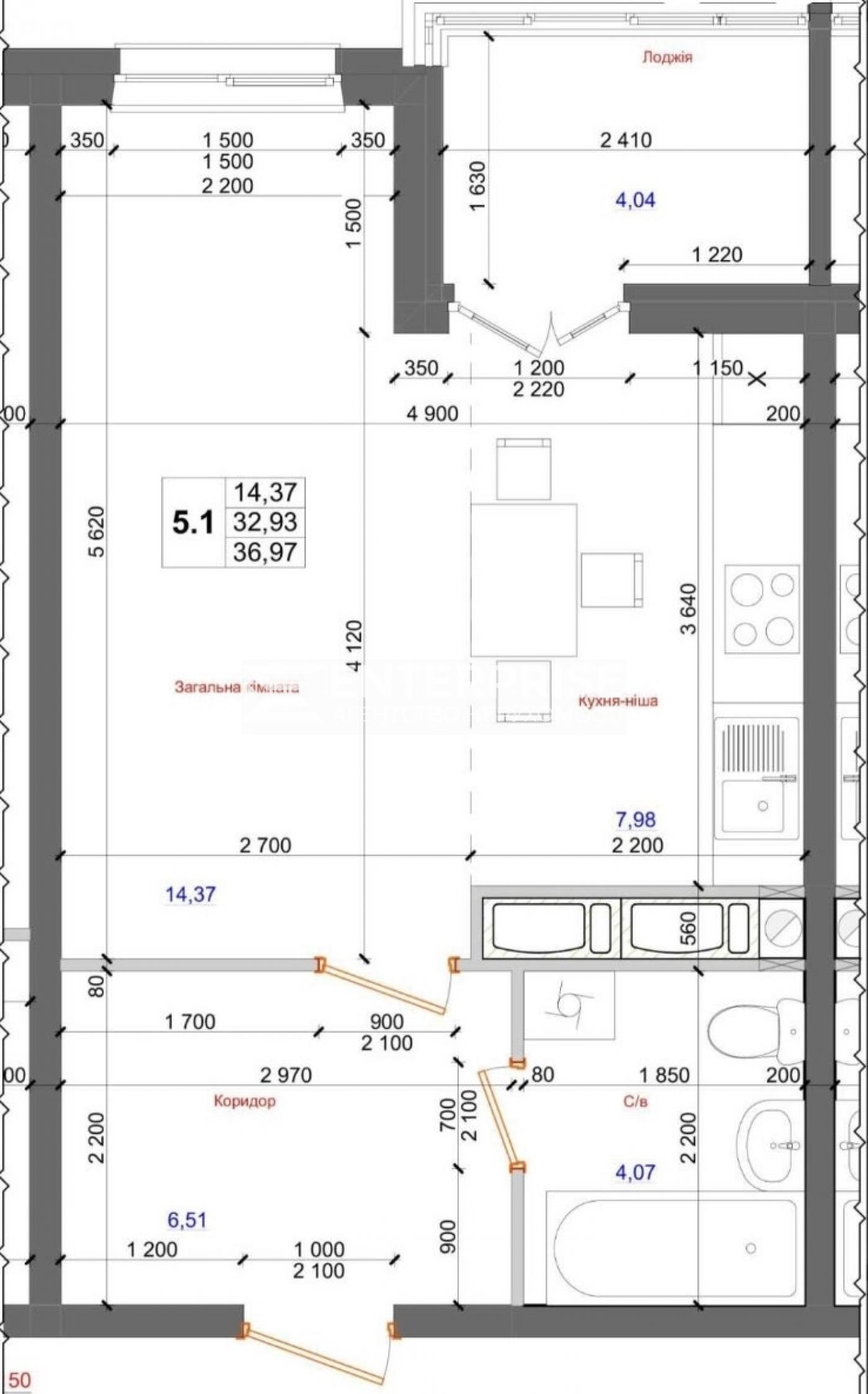 - Загальна площа: 36.97 м2