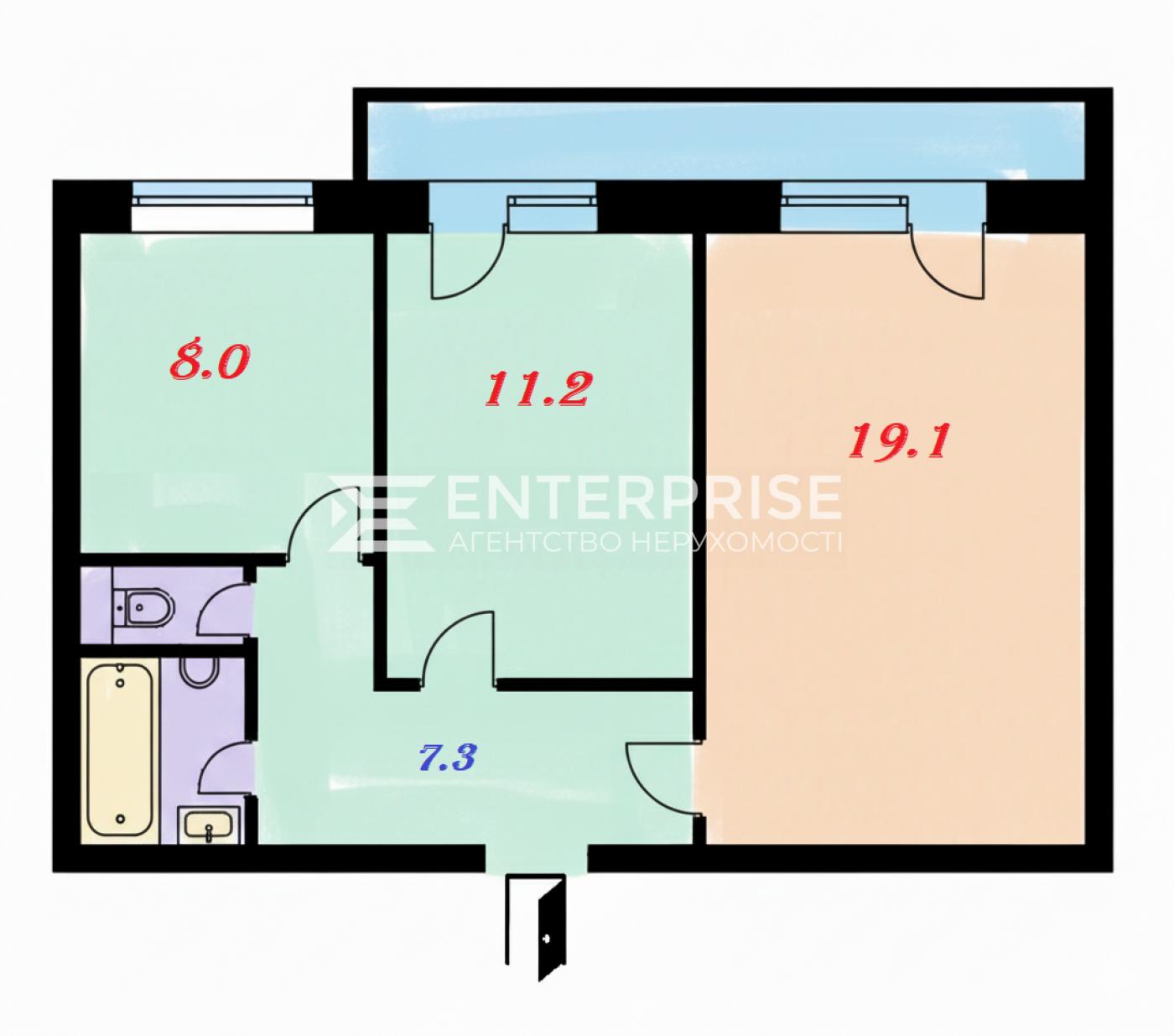 Загальна площа 51.5 м2, житлова 30.3 м2, кухня 8м2.