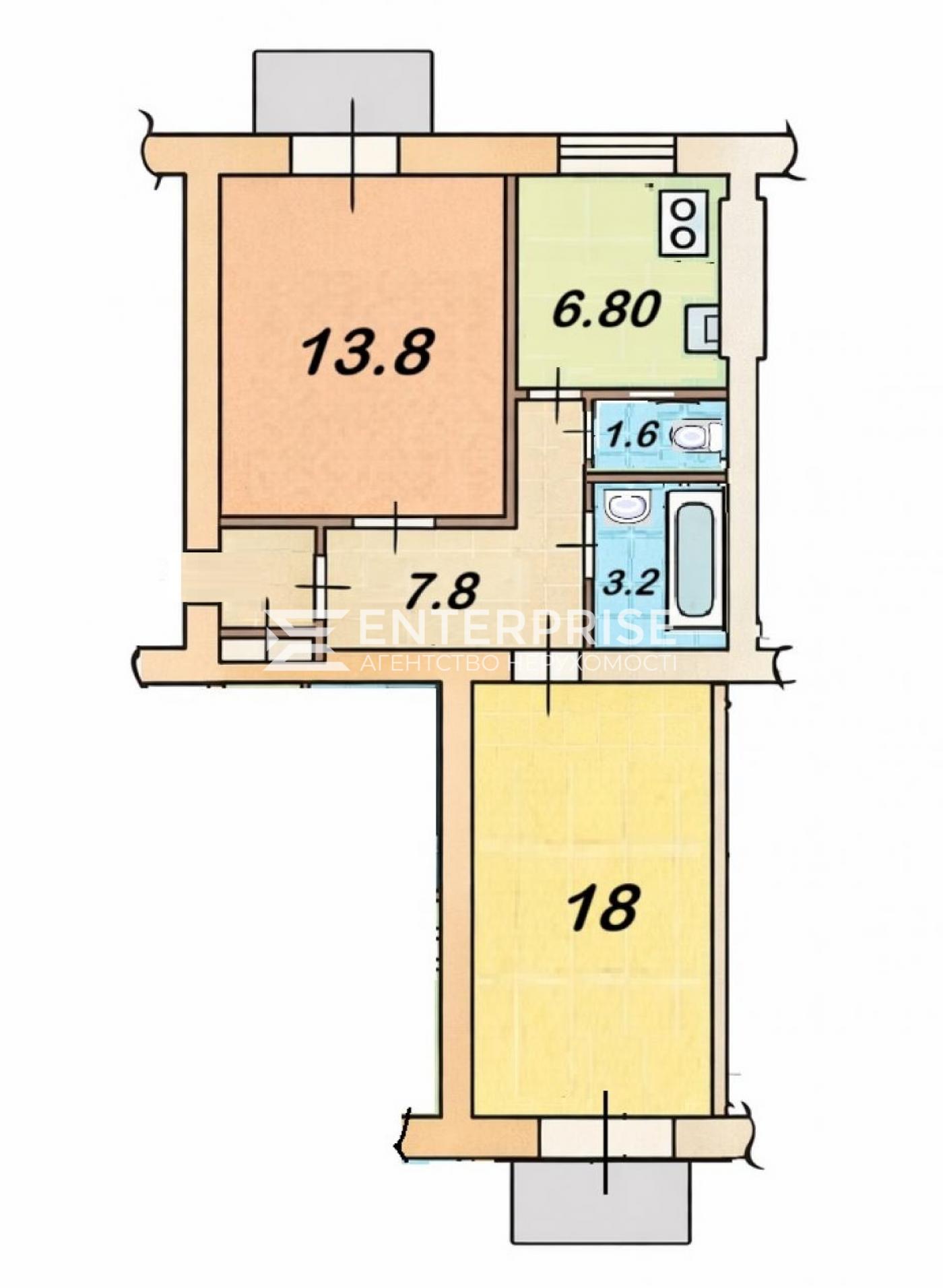 Окремі кімнати (18 м² та 13.8 м²), роздільний санвузол.