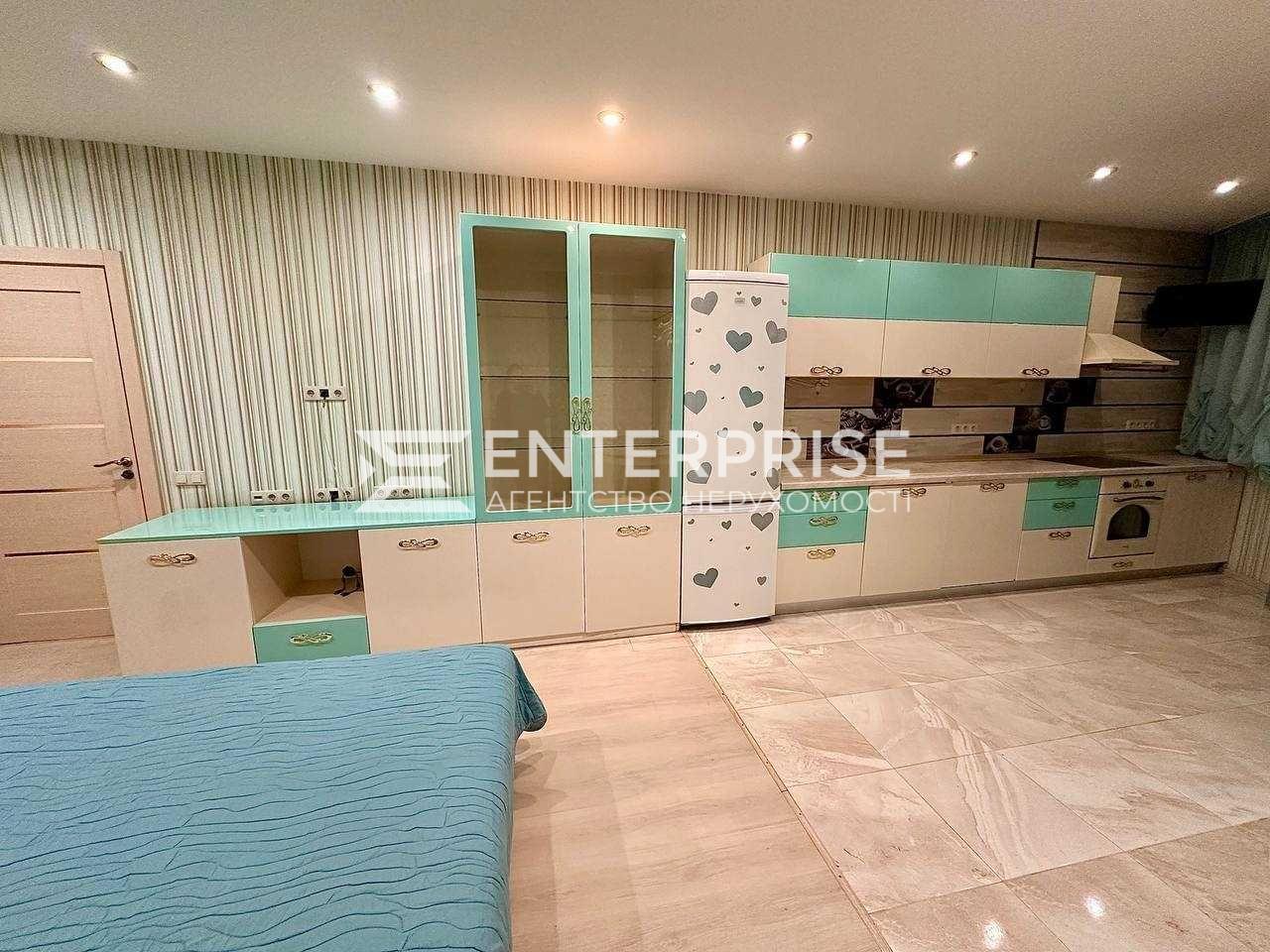 Кухня-студія з меблями, кондиціонером, посудомийною машиною, телевізором, двоспальним ліжком і балконом із диванчиком.