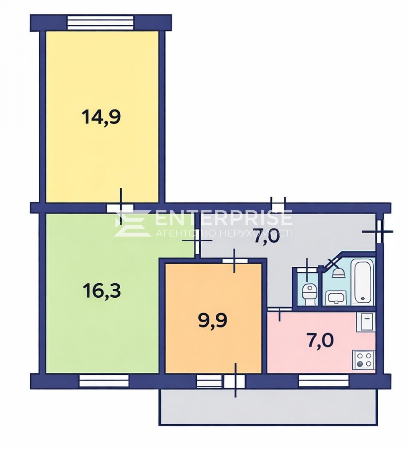 Квартира двостороння та розташована в середині 9-поверхового будинку на 7-му поверсі.
