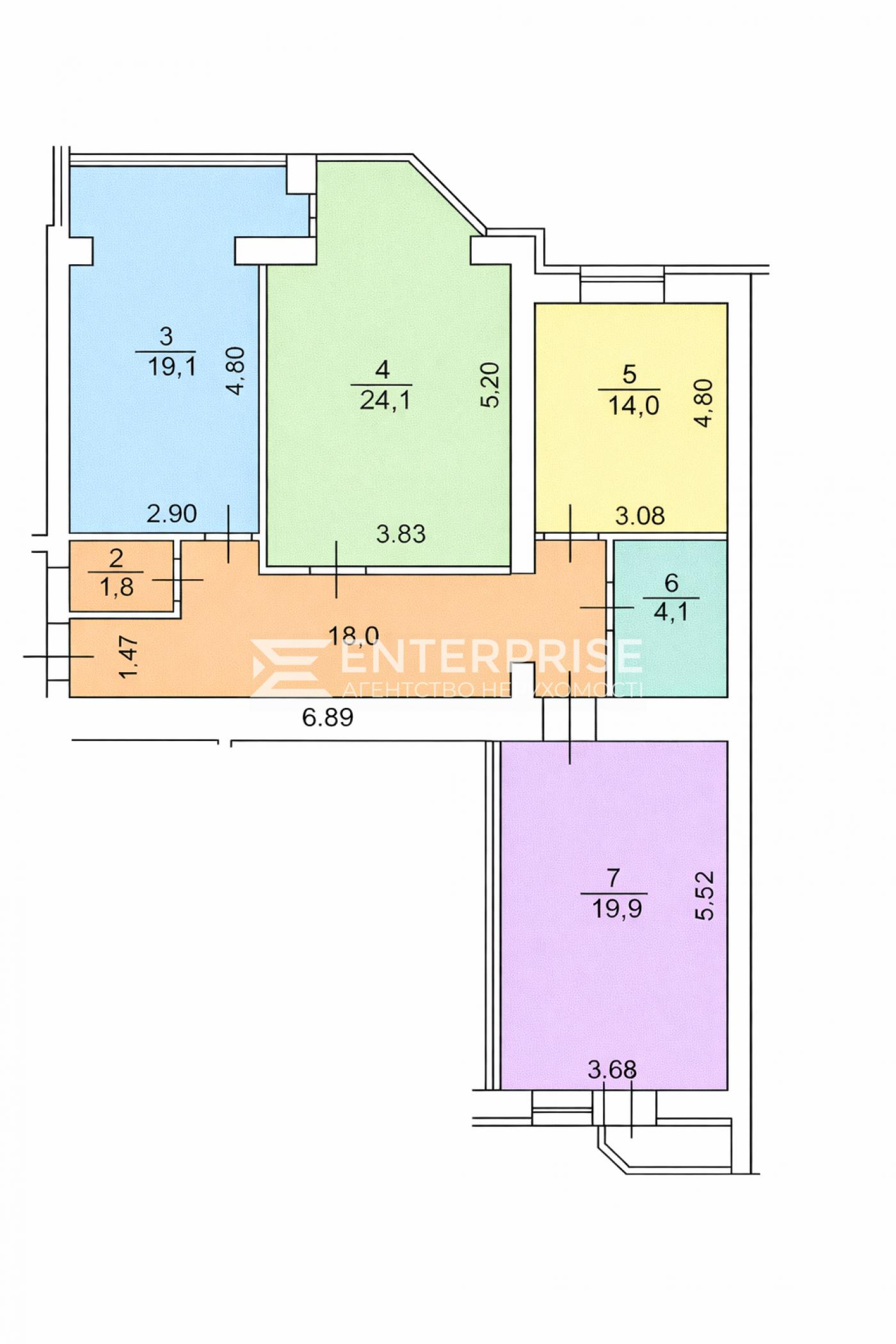 Загальна площа - 101.5 кв.м., житлова площа - 58 кв.м., кухня - 19.1 кв.м.