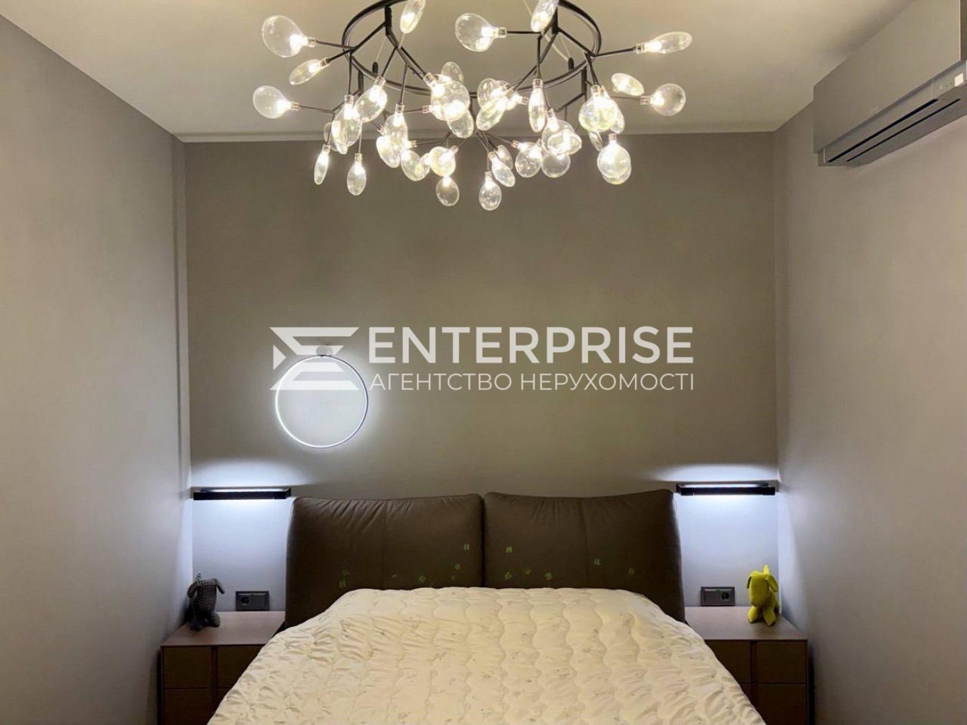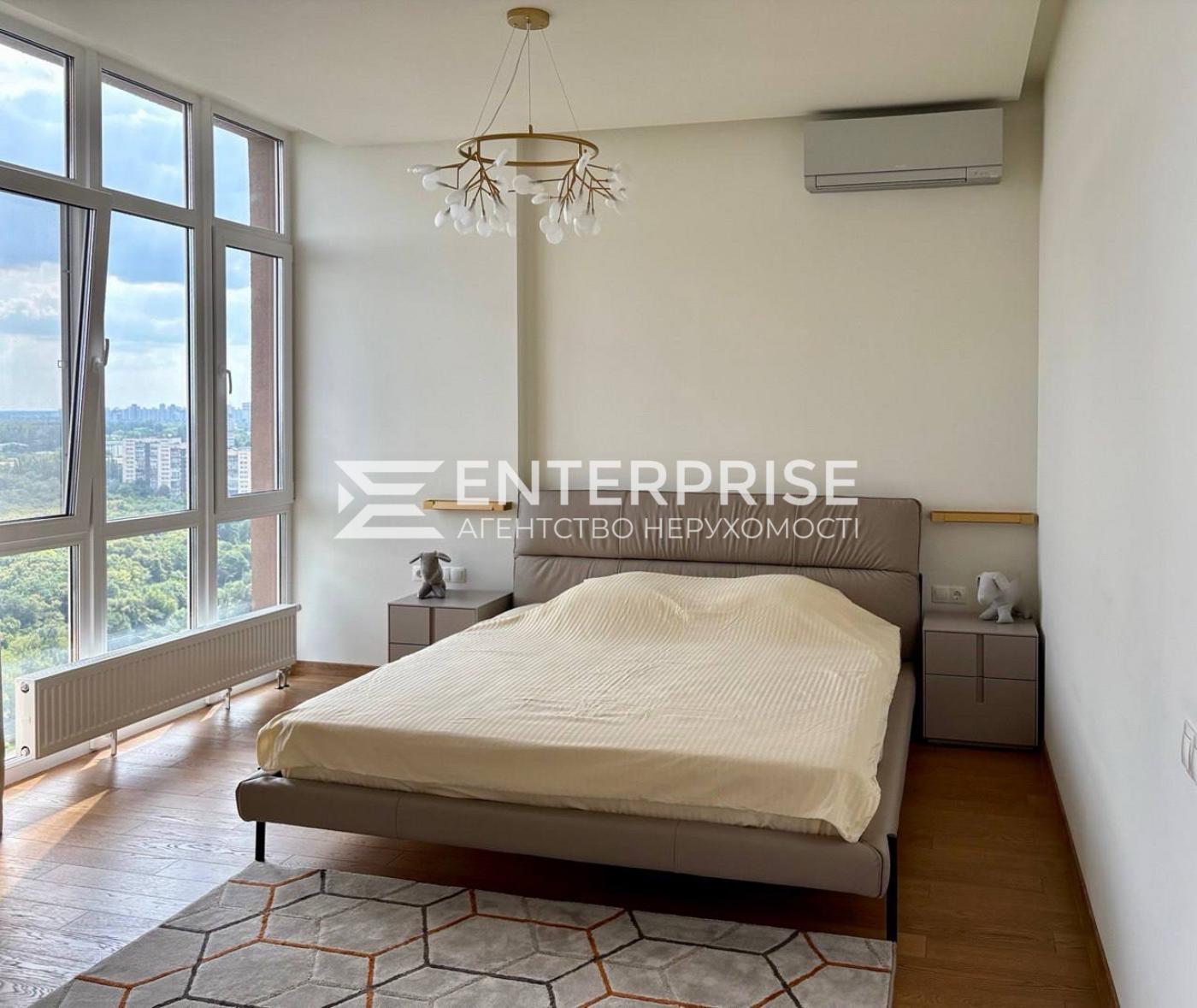 Дві спальні, простора вітальня з панорамними вікнами, велика тераса з видом на парк, гардеробна кімната, два санвузли, сходи з підсвіткою.